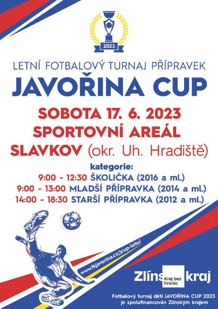 Zveme všechny fanoušky na fotbalový turnaj dětí JAVOŘINA CUP, který se bude konat v sobotu 17.6.2023 na hřišti ve Slavkově. V dopoledních hodinách (9:00 – 13:00) hrají kategorie školička a mladší přípravka, v odpoledních hodinách (14:00 – 18:30) bude hrát starší přípravka. Občerstvení zajištěno. Přijďte se podívat a povzbudit naše nejmenší fotbalové hvězdy.