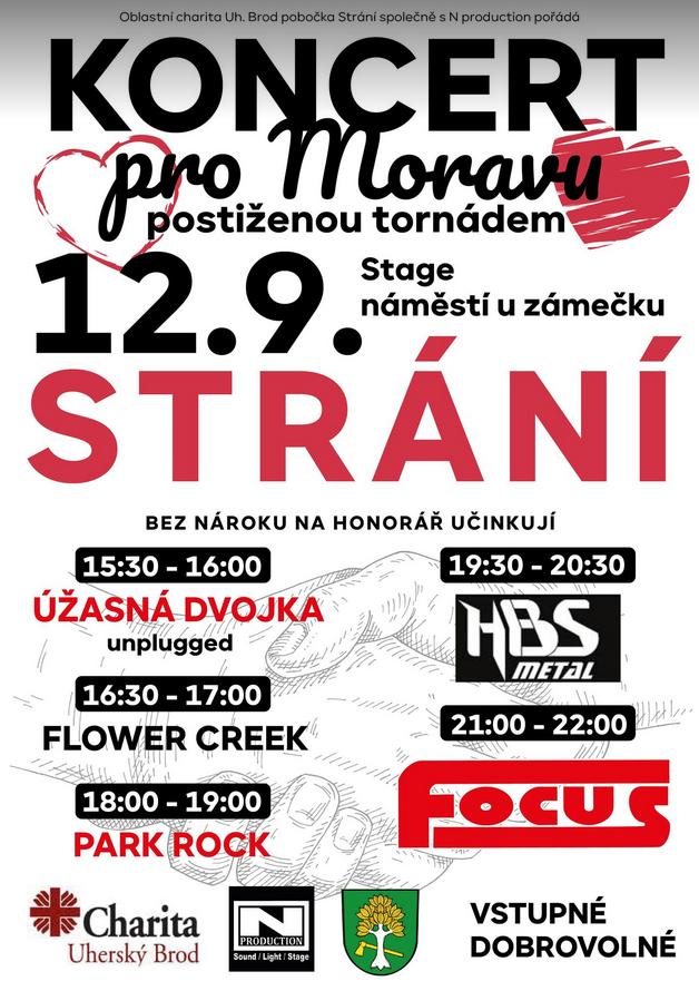 Charita Uherský Brod pobočka Strání společně s N production pořádá Koncert pro Moravu postiženou tornádem dne 12.9.2021 od 15.30 do 22.00 hodin na náměstí U Zámečku.