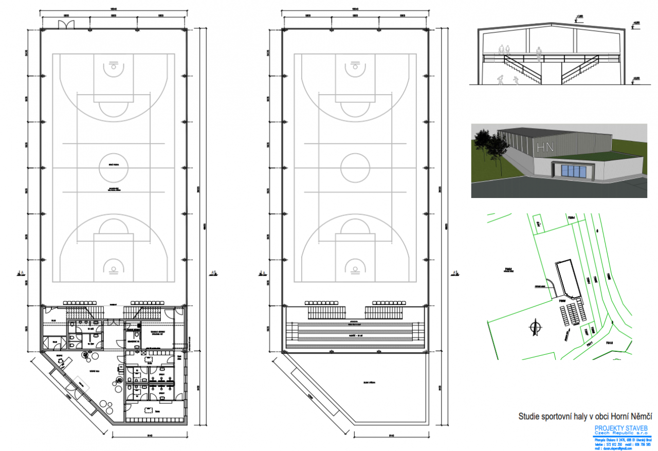 Naskytla se možnost na dokončení sportovního areálu a proto zkoušíme uspět s návrhem na dotace na výstavbu sportovní haly. Tímto by došlo k dokončení kompletního sportovního areálu (travnaté hřiště, hřiště s umělým povrchem, workoutové hřiště, dětské hřiště s minigolfem). Sportovní hala by byla umístěna za polyfunkčním hřištěm, tedy všechna sportoviště by byla na jednom místě. V současné době jsme na úplném začátku, řeší se odkoupení pozemků, studie, dotace a jiné. Rovněž přikládáme úvodní studii, která se bude dále, podle možností, upravovat a není tedy v této chvíli nijak závazná.